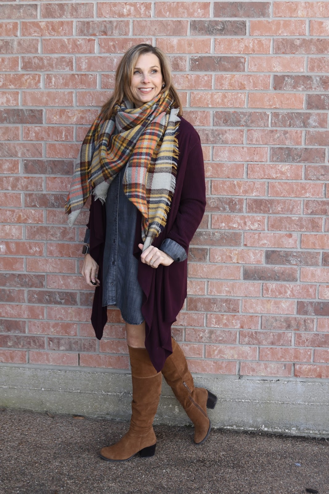 This is such a Shelly outfit and I mean that in the best way possible. Especially, that blanket scarf is one of your favorites. Love the dark wash in your chambray dress. Every woman needs a chambray or denim shirtdress in her closet. =)