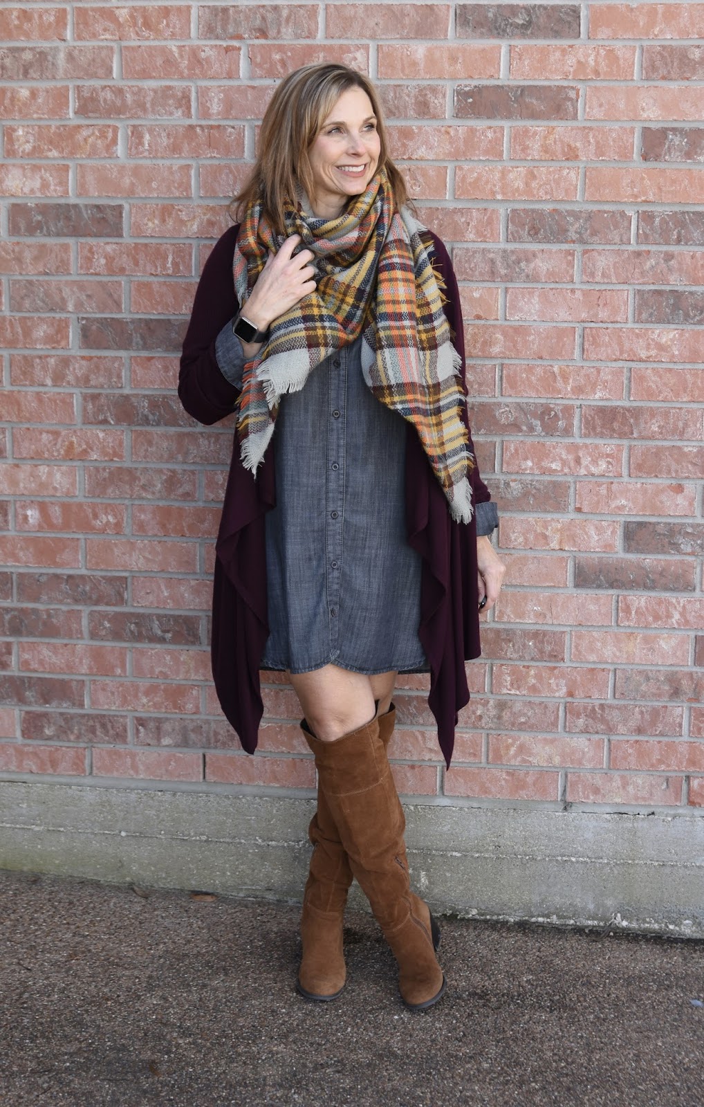 I love that chambray dress and how you styled it with the long cardi and OTK boots! I need to add these pieces to my collection.