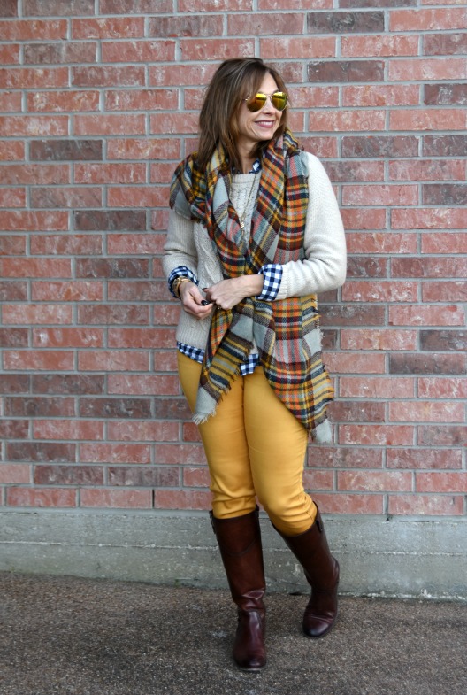 I bundled up with a blanket scarf in February and showed one look 3 ways. Gingham, plaid, these colors, what’s not to love here? If you are looking for a scarf in similar colors, this plaid scarf is marked down right now to $10!