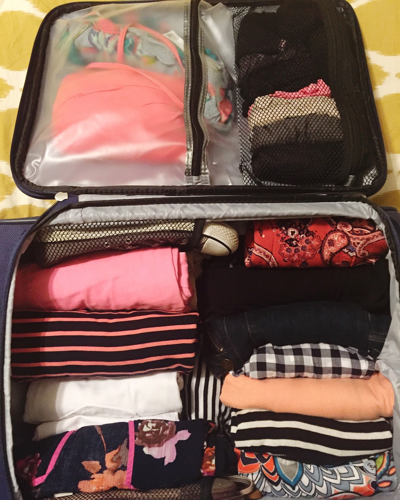 I am a serious over packer! My biggest fear is arriving somewhere and not having a thing to wear. Thankfully since learning to tight roll my clothes, I can still take way more than I need but fit it all in my carry on. I also added two curling irons, my camera and my makeup bag!