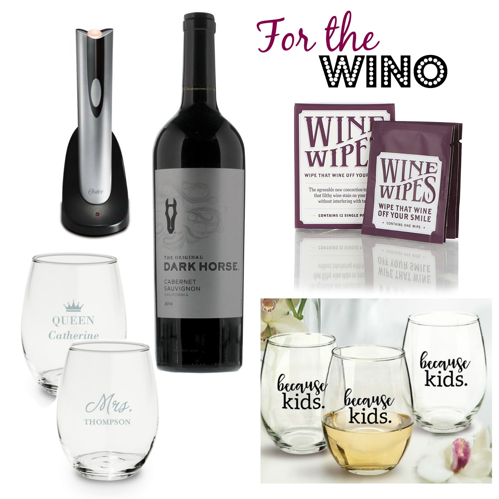 If you have a wine lover on your list I think any of these would make an excellent gift.  I ordered the electric wine opener after Katie listed on her gift list and I’m super excited for it to arrive.  A bottle of wine is always easy and it doesn’t have to be expensive to taste good.  Plus if you head to a liquor store you can typically find a bottle with a pretty holiday label. I would pair a bottle or a cute wine glass with the wine wipes for a perfect gift.  Did you know Shutterfly has personalized wine glasses? Well they do and there are some super cute options which can be personalized!  Personally I need the because the kids wine glasses!