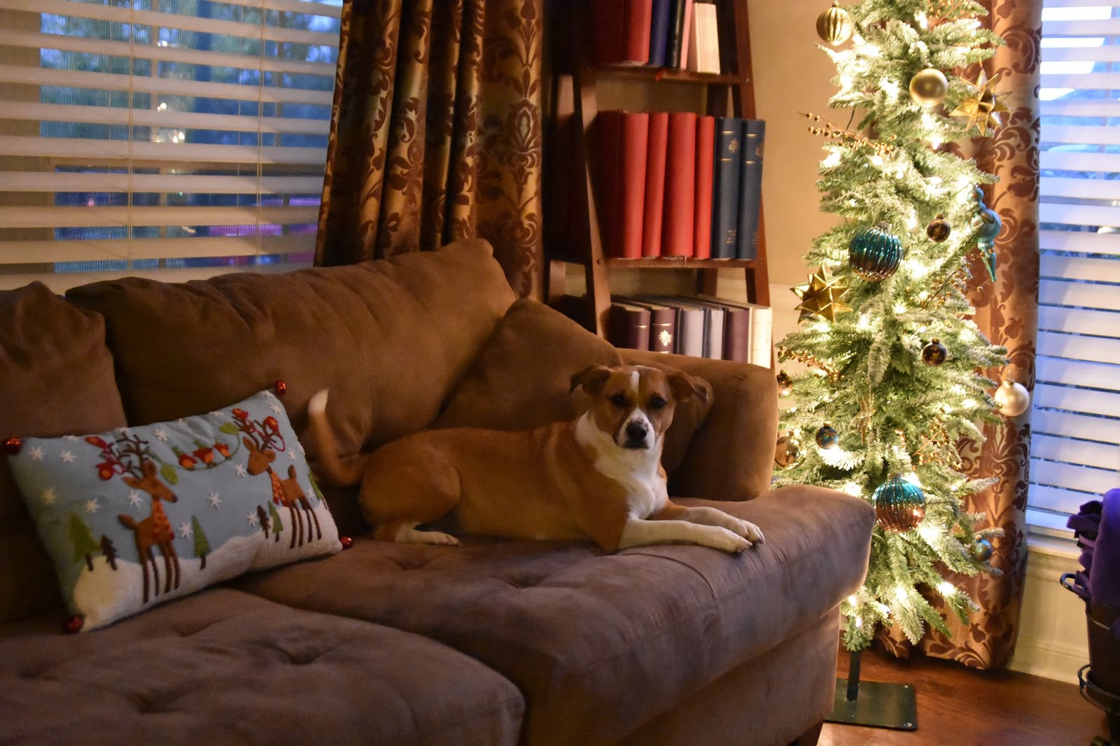 We also have a slim tree in the front room where the kids hang out.  I thought the reindeer pillow was too cute not to have it!