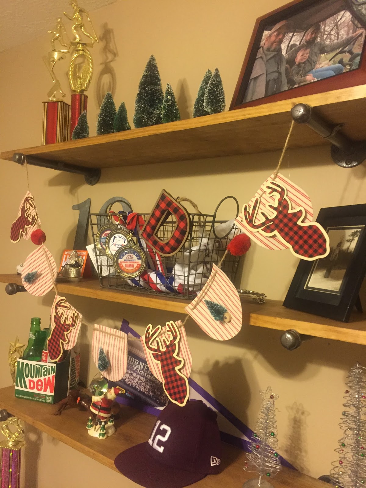 Due to the lighting I did not take pictures in the kids rooms either but hope to add some later if the sunshine cooperates!  I do not go overboard but do love to add a few little touches.  I grabbed a few things from the Target dollar spot and made this fun little banner for Dillon’s room and I was super proud of myself.  A few bottle brush trees here and there and he is feeling as merry as any 14 year old actually feels.