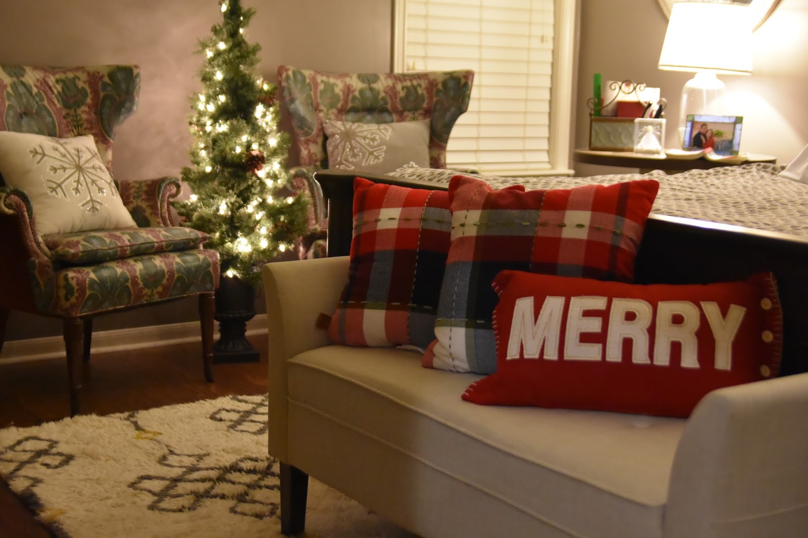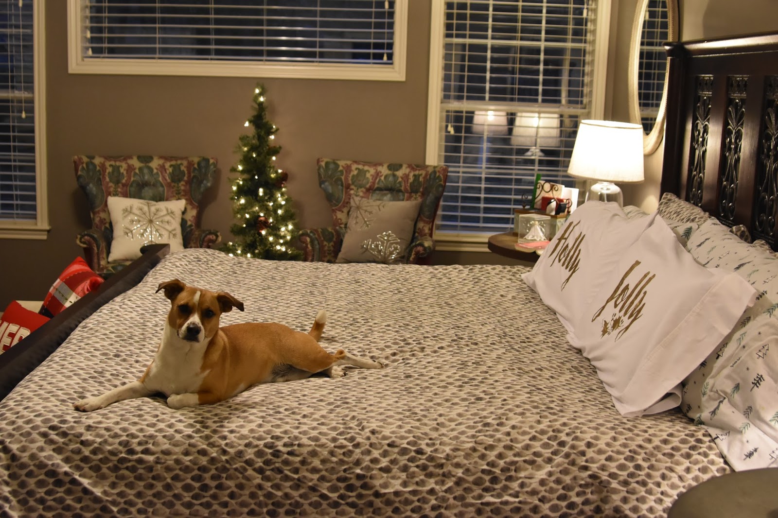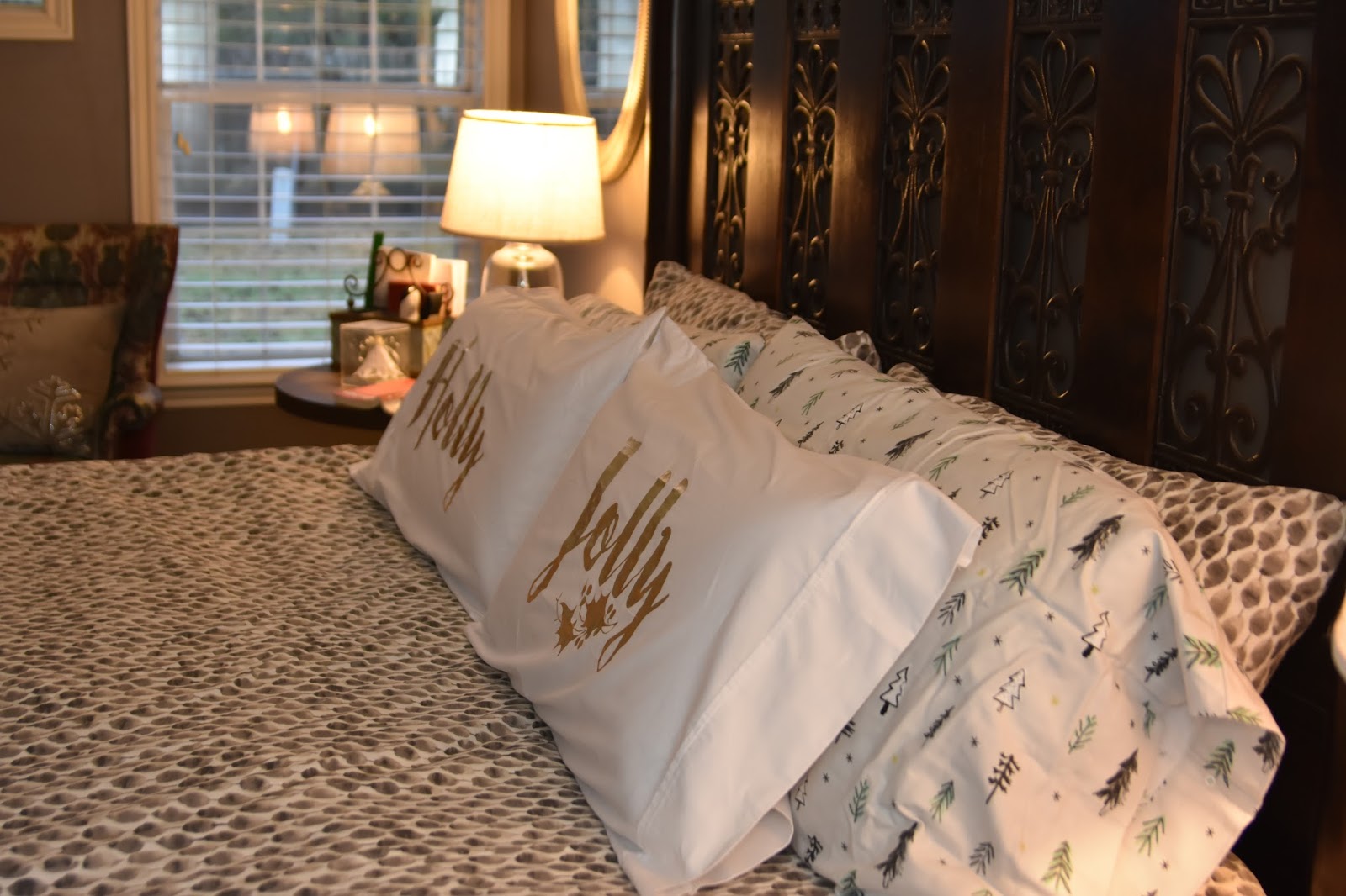 I try to add a little merry in our bedrooms too and, again, pardon the crap lighting.  This year I found these fun pillow cases and knew they would be a perfect addition! We are always feeling holly jolly this time of year when our head finally hits the pillow right?!!