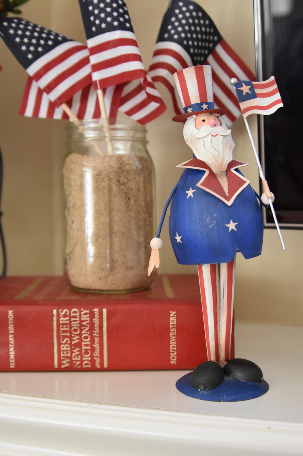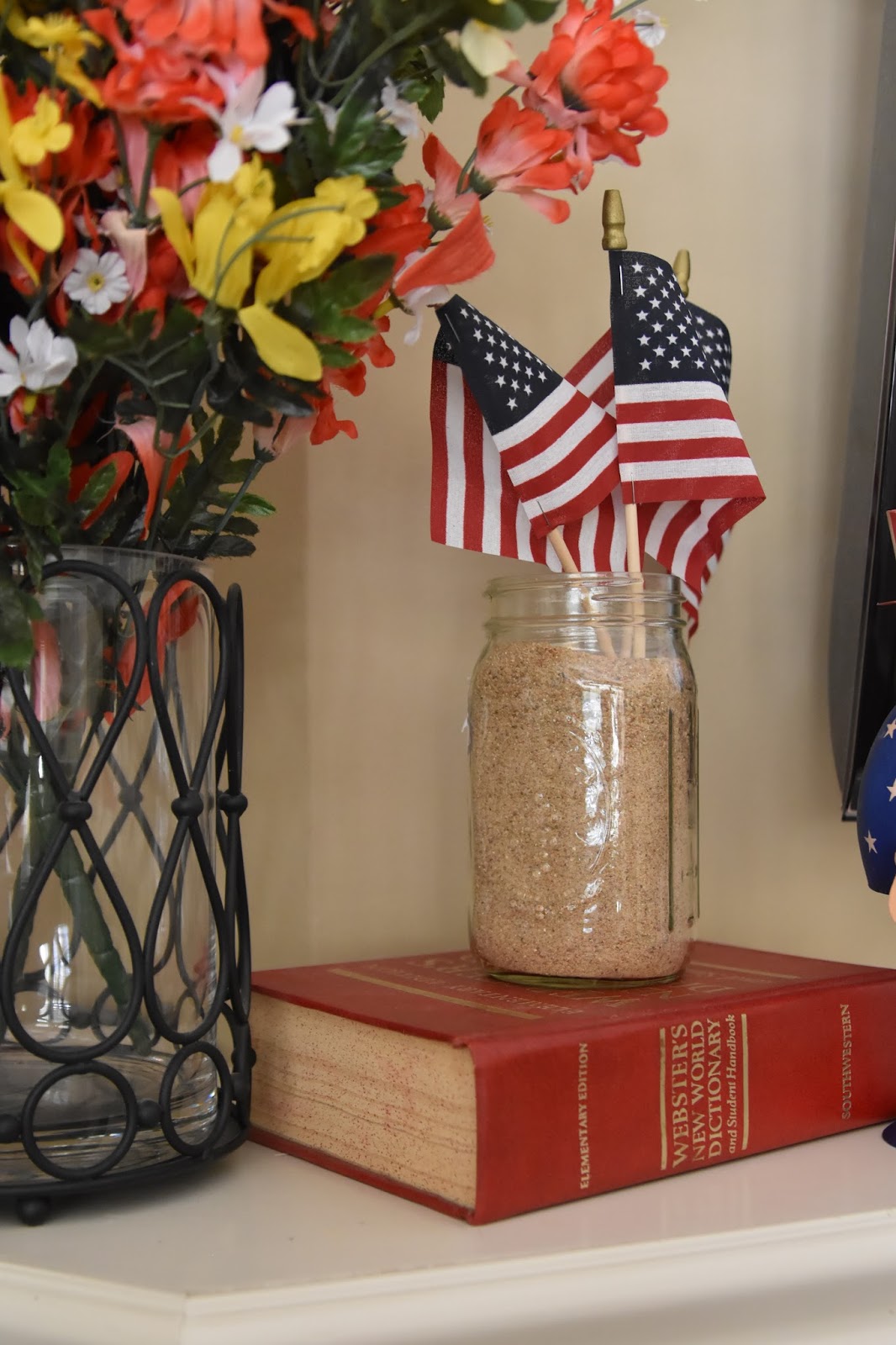 I grabbed this simple idea from Kim’s post too. I mean it just doesn’t get any easier than sand in a mason jar and little flags from the Target dollar spot!