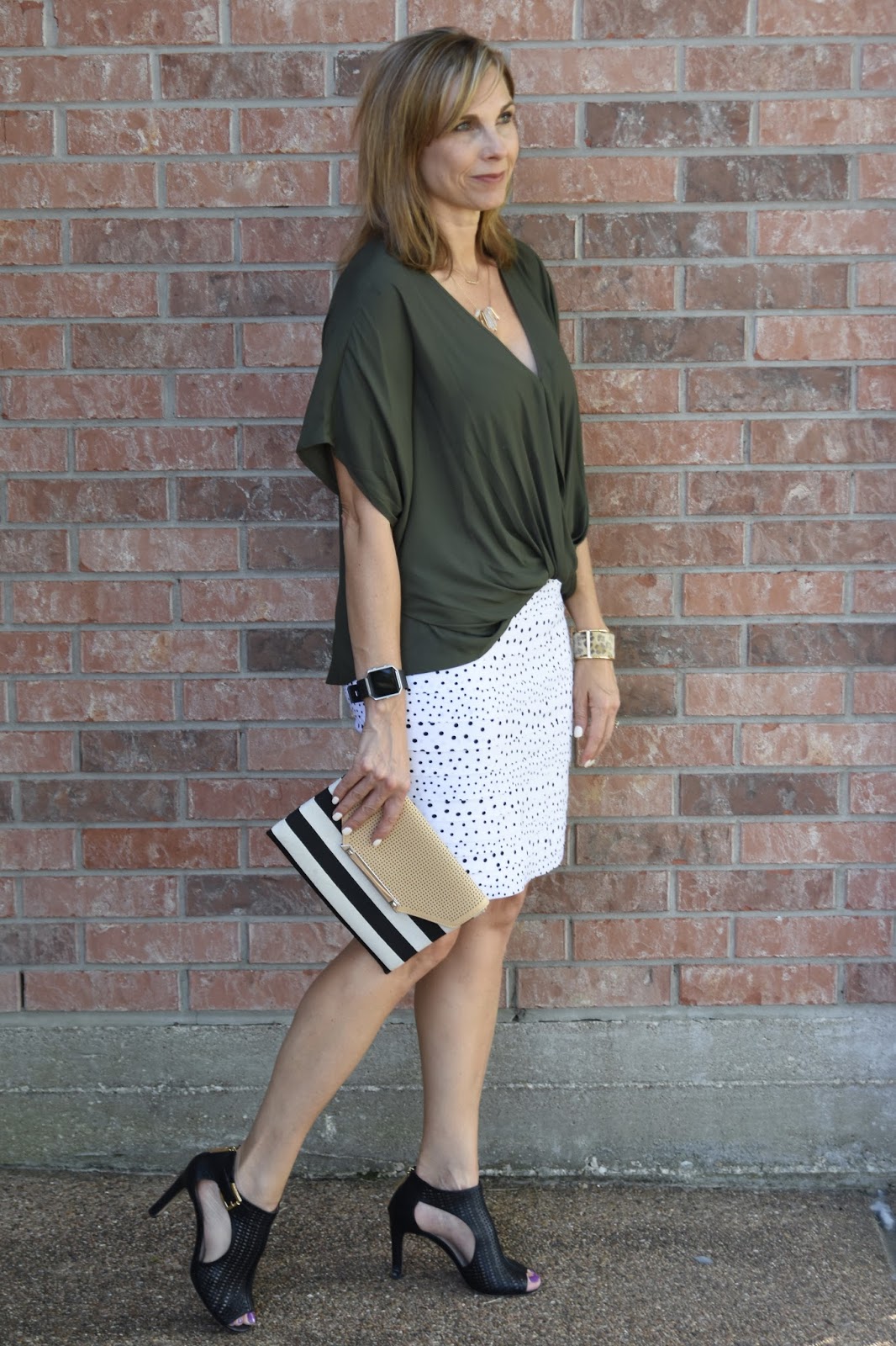 White House Black Market skirts rarely disappoint and this fun dotted skirt has been in my closet for several years but I’ve really been trying to stretch it in different ways. Polka dot pattern play is one of my favorite patterns to mix up.