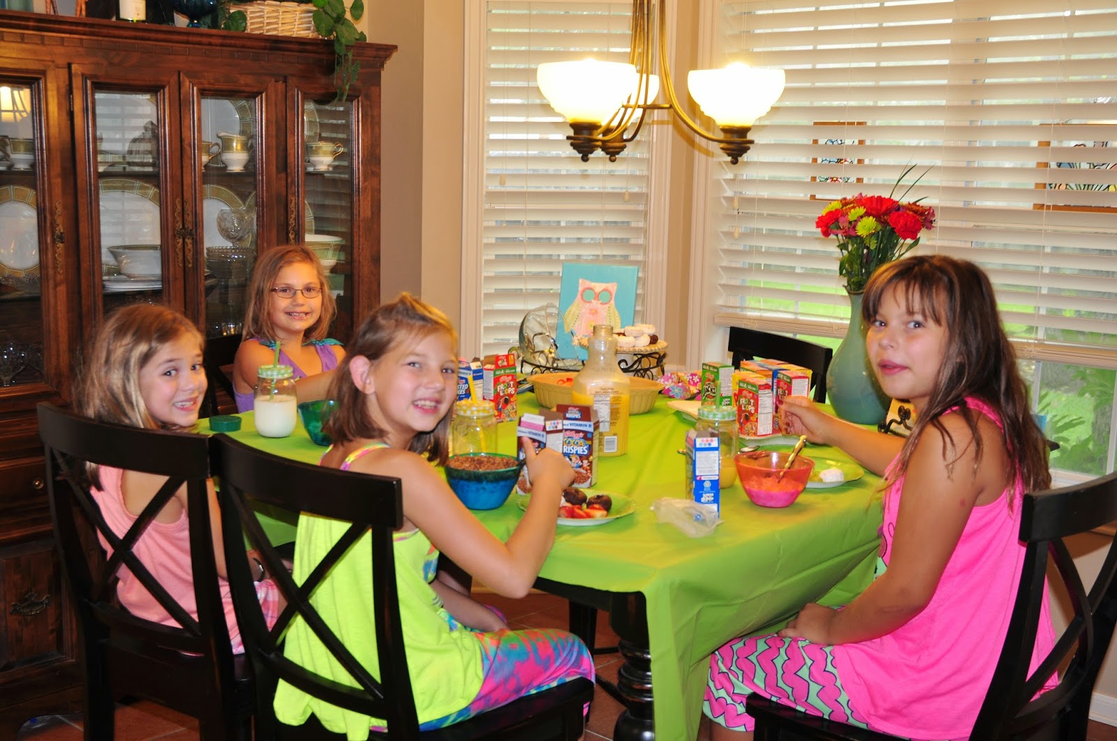 The girls watched a movie….and were adamant that it could NOT contain princesses or make them teary eyed. They chose Bedtime Stories and ate popcorn and trail mix while they giggled alot. I finally turned in about 11:15 and I’m not sure how much later they stayed up but they were up and raring to go at 7:30 Saturday morning. I made breakfast super easy….store bought donuts, cereal, strawberries and grapes.