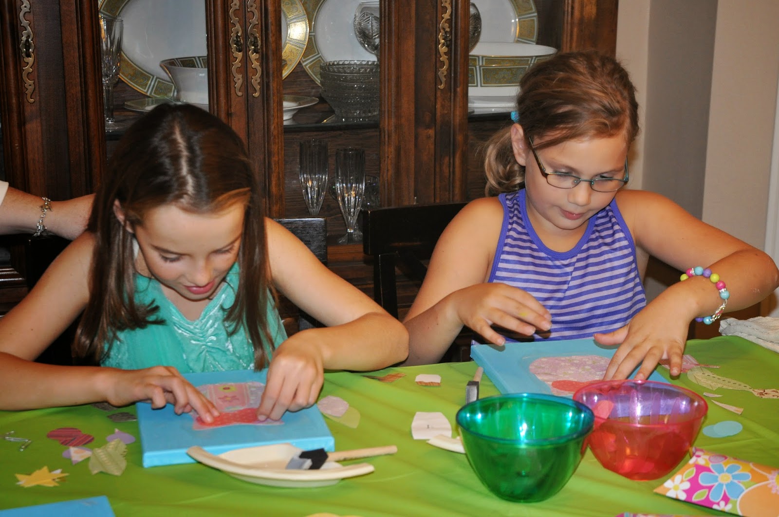 I painted the canvases blue ahead of time and had the scraps available. Thankfully Aunt Amy and Mimi, aka the Modge Podge experts, were on hand to give some direction.