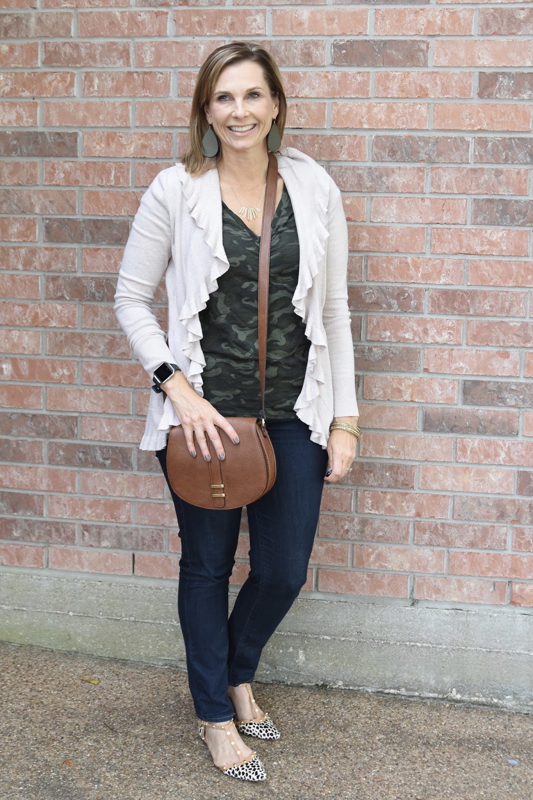 I think the feminine cardigan was a fun choice for your camo tee! Now I really want a camo tee and a crossbody bag. 🙂 Now that my hair is growing longer I may try a pair of Nickel and Suede earrings, too.