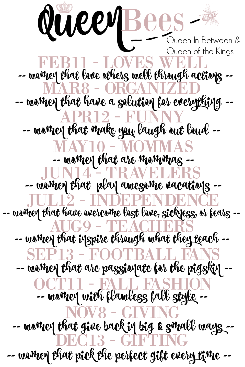I have so much to do to get ready for our trip later this week…..and trying to figure out when that will happen! It may be slow blog week for sure. Be sure to tune in on Tuesday for the Queen Bee series when I will be highlighting a woman who inspires me with her organization! Katy and I would love for you to link up with us to honor any woman who inspires you but we did pull together the following prompts for the year just in case you need a little help narrowing down someone in your tribe!