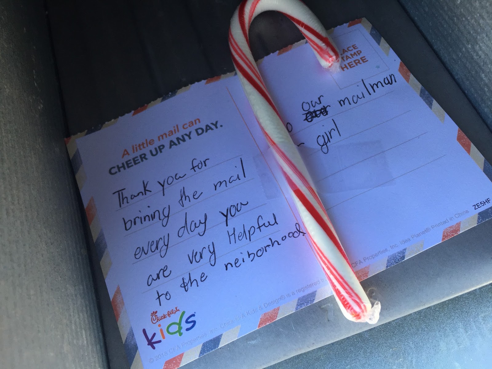 The Chick-Fil-A kids meal has been knocking it out of the park with random acts of kindness and this week Carly’s included a book of little postcards. She wrote one to our “mailman or girl” and added a candy cane. I came home at lunch and had to go sneak a peek at what she wrote! Words of affirmation are this girls love language! #notetoself