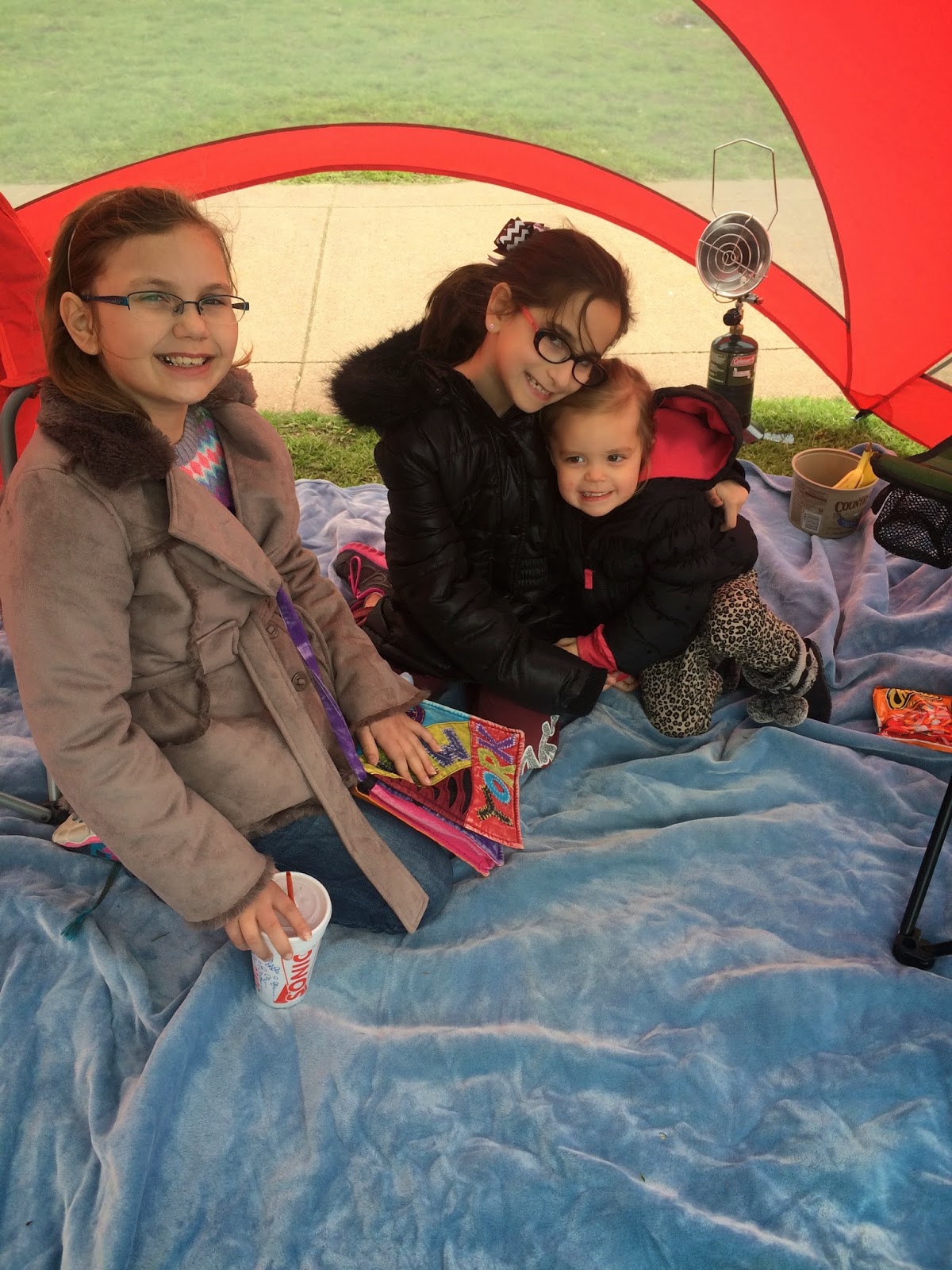 It was a super cold day for baseball and these sisters were lucky enough to have a tent complete with propane heater to hand out in.