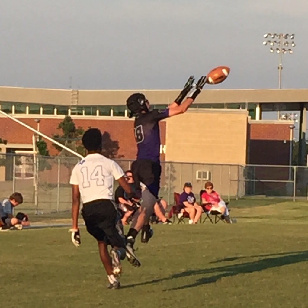 Dillon played some 7 on 7 on Thursday evening. I think I love it because it is really fast paced and I feel like I can see what is going on better than regular football. Love to see this boy enjoying his time on the field!
