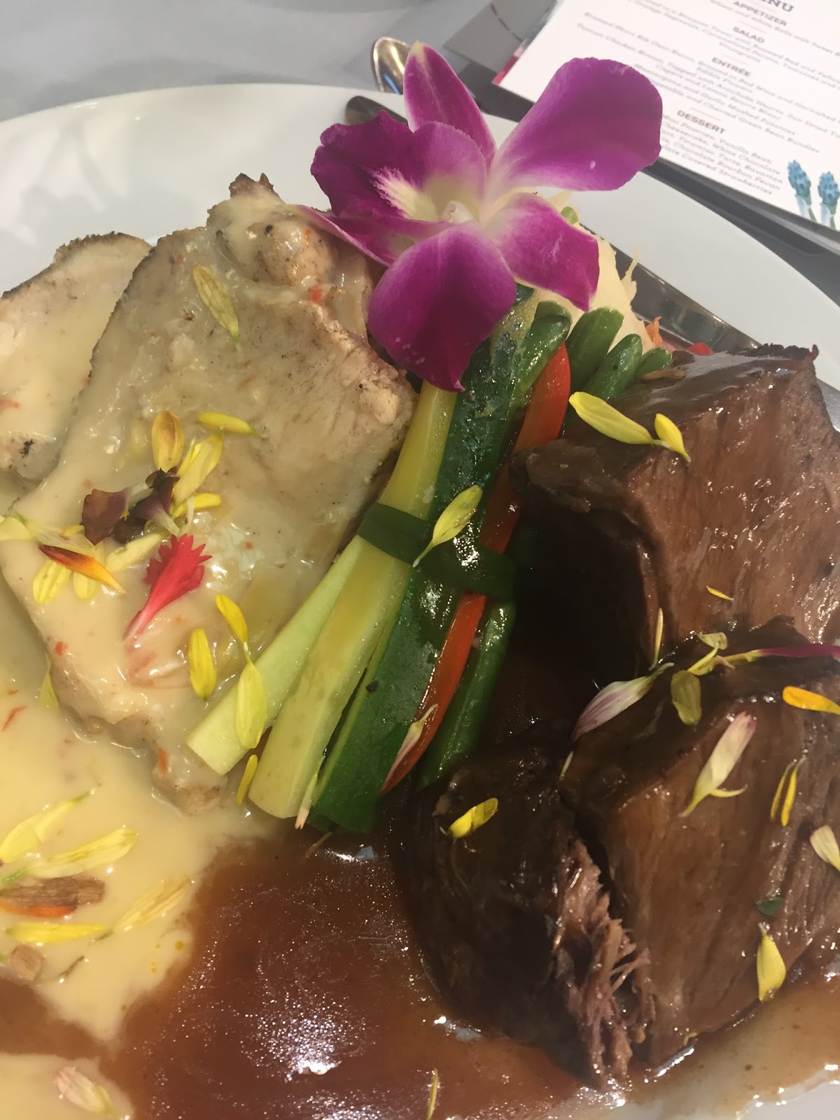 Then things became a little interesting with edible flowers, icky chicken and tasteless veggies. I ate the beef but that was it. I just cannot eat a flower.