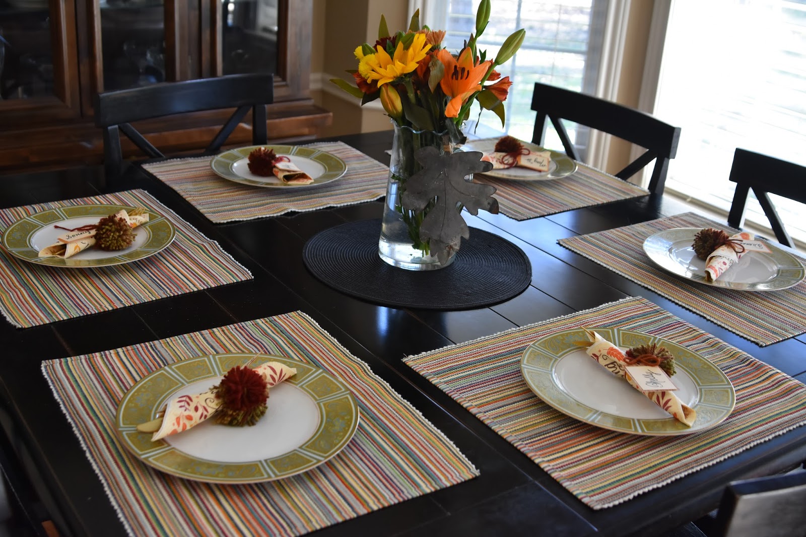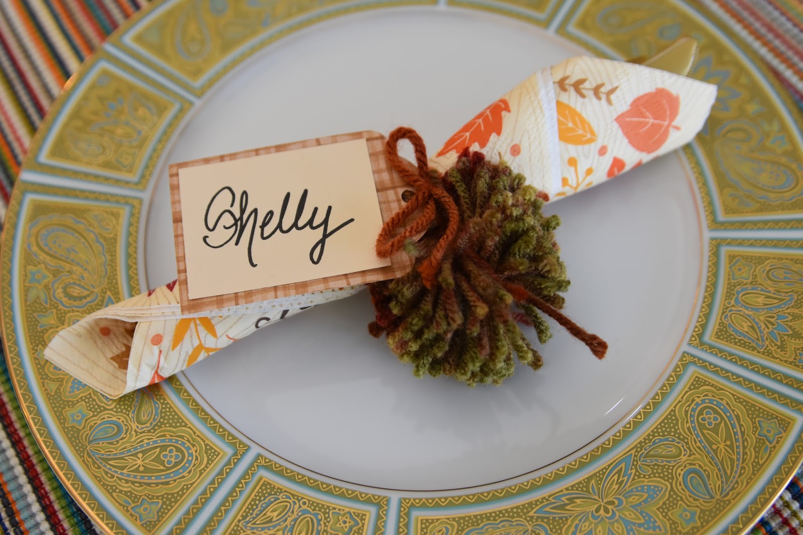 So one thing I will not ever claim to be is a decorator or a hostess. I love having people over but I am better off in the kitchen doing the actual meal prep than setting a table. This year my sweet mother-in-law wanted to handle the dressing and so I had time on my hands. Also not something that works really well for me! Carly made these pom poms and we attempted a these little nameplates and even pulled out the china I inherited from my uncle.