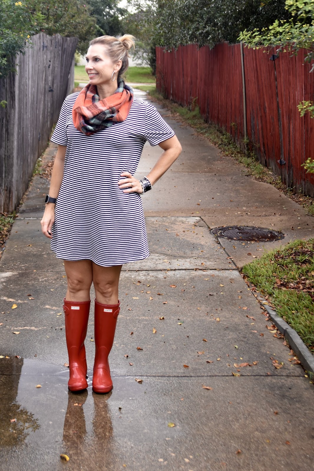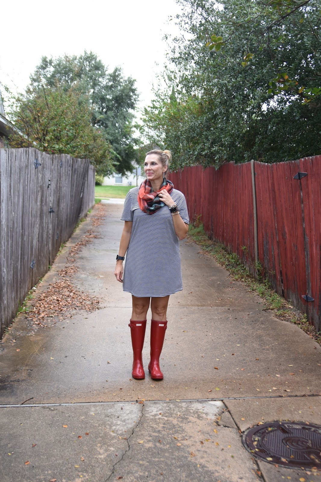 Happy, happy birthday pretty lady! My 47th is coming up in a couple of months, and while I don't mind growing older, it isn't fun to move up on that box. 🙂 Your red Hunter's look so cute with your striped tee dress!