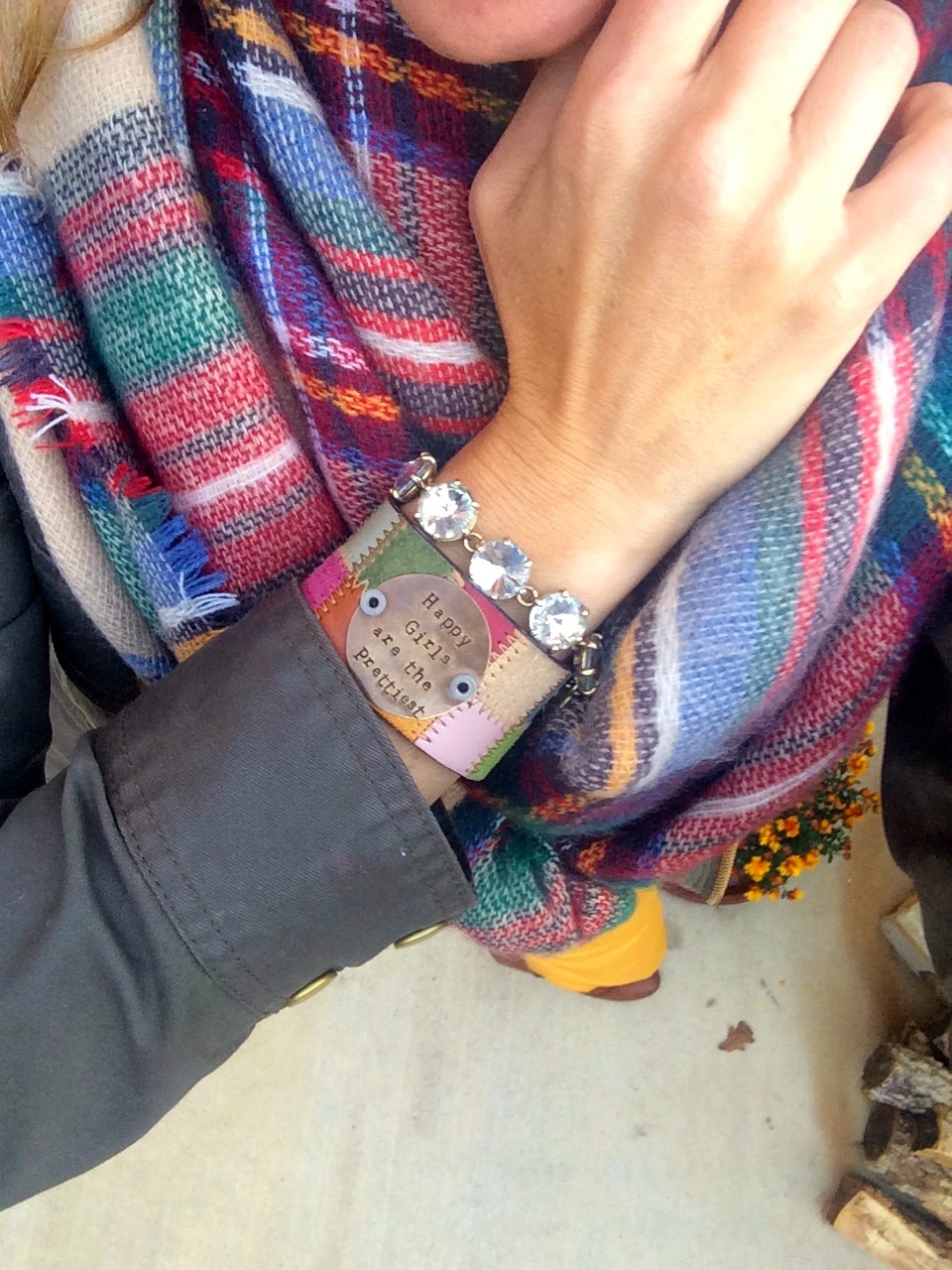 And if you have never heard of Farmgirl Paints I ordered my first custom cuff when her shop was opened in September. I wasn’t sure if I would wear it as much but it is so fun and I have caught myself planning outfis around wearing the cuff. You pick your own quote and I chose “Happy girls are the prettiest”. Happy with my choice! Here is her Etsy shop link if you are interested as she only opens a few times of year and actually closes this Friday. Farmgirl Paints Etsy Shop