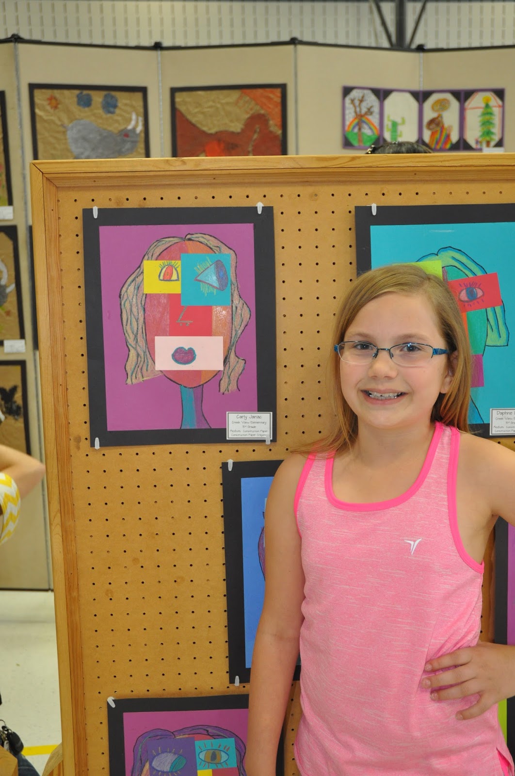 But first we will stop by the school district art show where Carly has a piece of art on display! Here is her self portrait Picasso from last year!