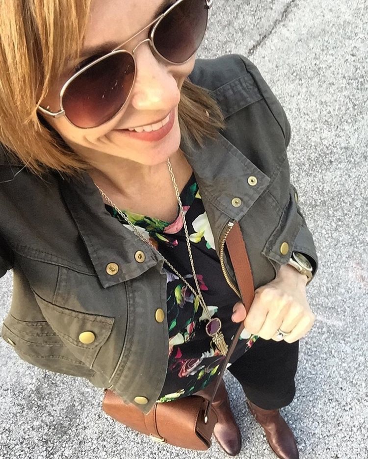 My favorite field jacket (similar one here) over a floral top to start thinking about spring! Trading out scarves for a fun necklace as the temperatures start rising. My crossbody is sold out but you can find a similar option here or here which are also priced well. I am restraining myself from purchasing this Sole Society bag.
