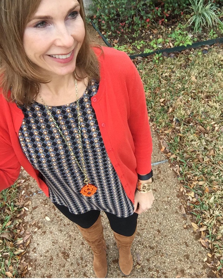 After Riley signed last year I started paying attention to orange and navy with hopes I will eventually have a chance to wear it! Love how this Pleione top came together with a little spring color but still holding onto winter with my OTK boots.