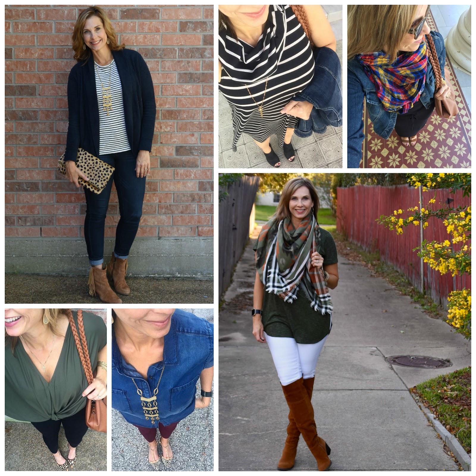 Navy Cardigan||Leopard Clutch||Striped Top||Fringe Booties||Striped Swing Dress||Black Booties||Olive Blouse (3/4 tab sleeve version here)||Leopard Heels||White Jeans||OTK Boots||Southwestern Scarf