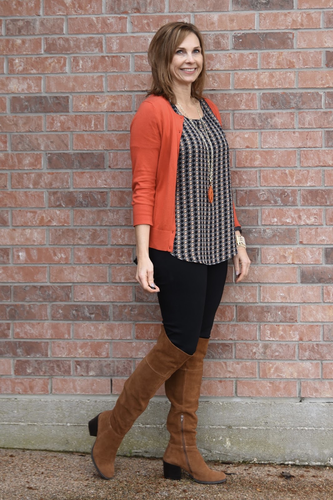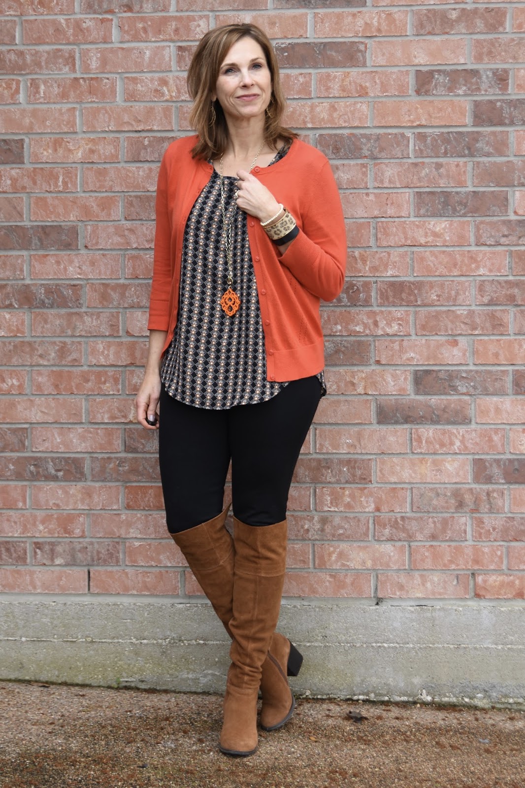 5. I love this look–the pops of orange are perfect, and I love the subtle print of your top. I just clicked over and read about your son–how awesome that he signed with the Astros. That is really too cool! I'd be wearing lots of orange if I were you too 🙂