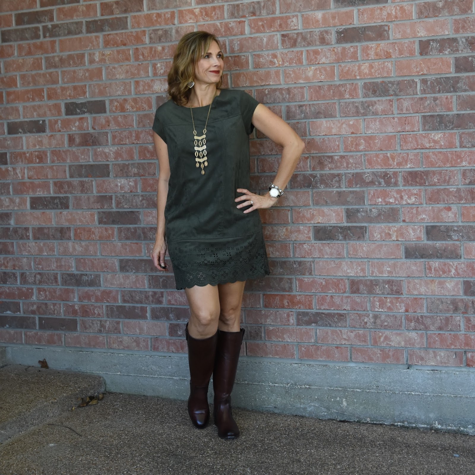 I saw this dress in our Target, but it was in teal. I almost tried it on, but was worried about the capped sleeves for winter. I know I could layer, but at the time, I couldn't think of what I had to layer it with. I loved the scalloped and cut out bottom of it. Suede is so popular right now, too!