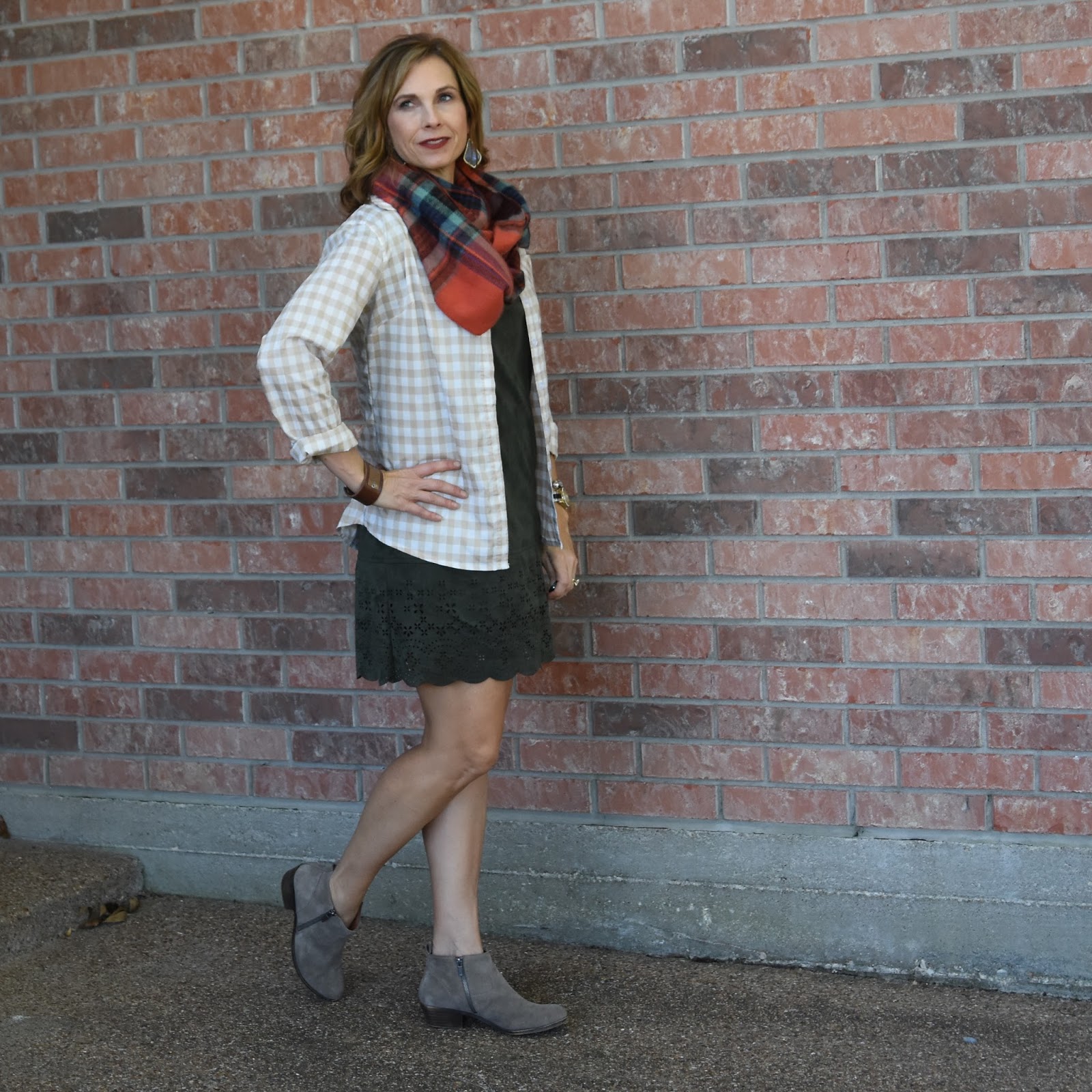 For a more casual look, say even for a family gathering on Thanksgiving day, I added some of my favorite pieces to dress this down a bit. I love this gold gingham top and you can visit Tara Lynn’s Boutique and receive 15% off your entire order with the code Gold. I cannot say enough about this top and there is plenty of other goodness there.